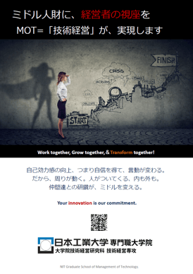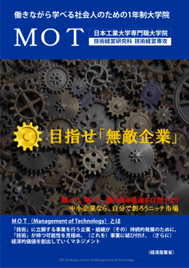 このページは、日本工業大学MOTオフィシャルサイトではありません(ビジネススクールの雰囲気を紹介したり、セミナー等の受付をするための修了生による大学紹介サイトです)。大学院に関する正確な情報をお知りになりたい方はhttp://mot.nit.ac.jp をご覧ください。