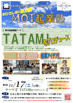 今回の起業塾は、多くの経営課題を抱えながら個人で畳店を営むS氏に登壇いただき、日工大のSMEスピリットを存分に発揮して新たな「TATAMIビジネス」のアイデアを考えます!