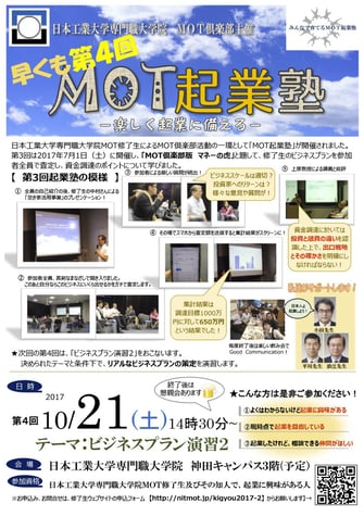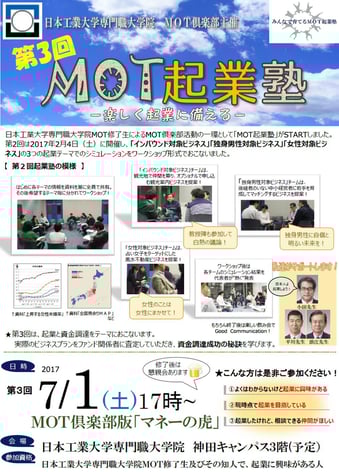 MOT倶楽部による人気企画『MOT起業塾』の第6回が11/17(土)に開催されます。